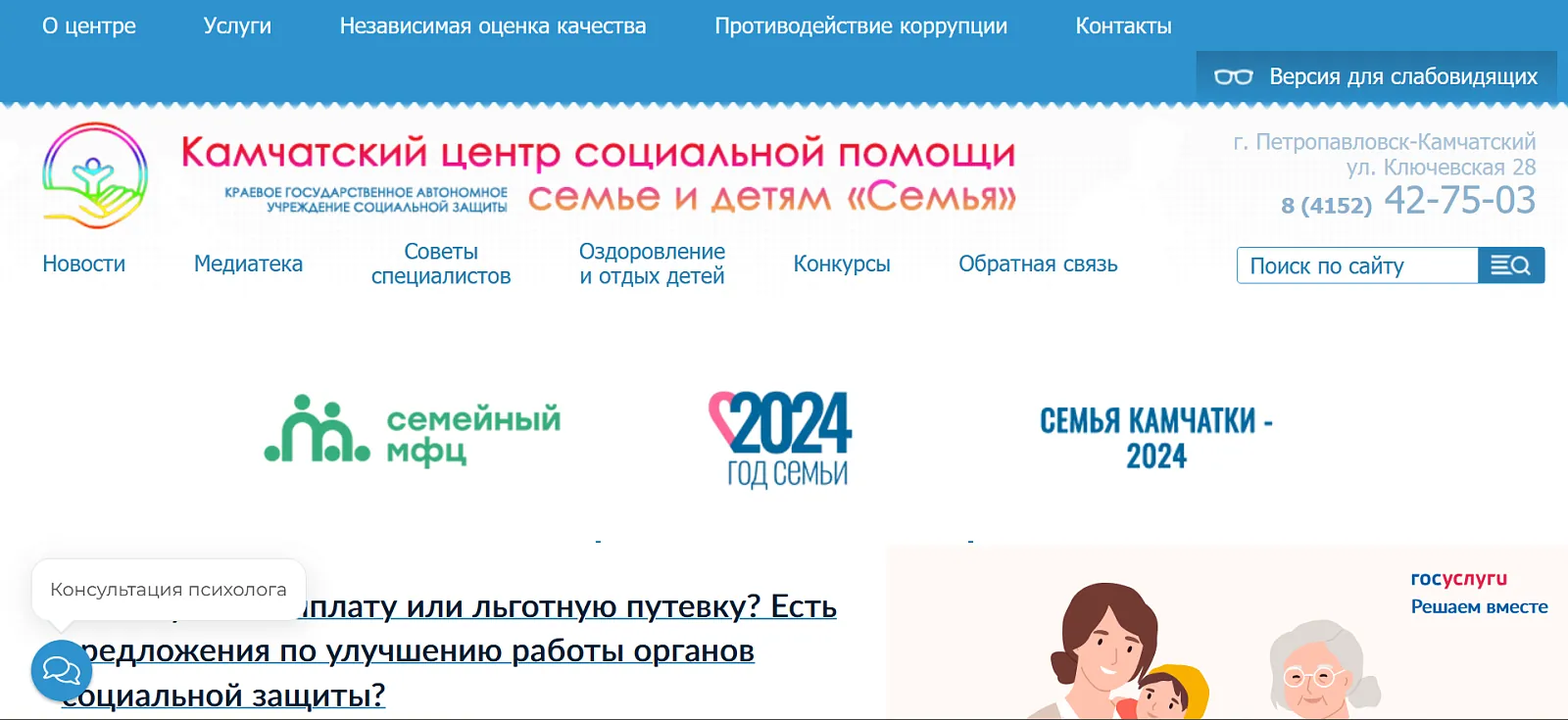 Поработали с довольно старым сайтом Камчатского центра социальной помощи. Обновили 1С-Битрикс до последней версии, перевели сайт с устаревшей кодировки windows-1251 в UTF-8, что отказывались делать многие разработчики, предлагая просто сделать новый сайт.